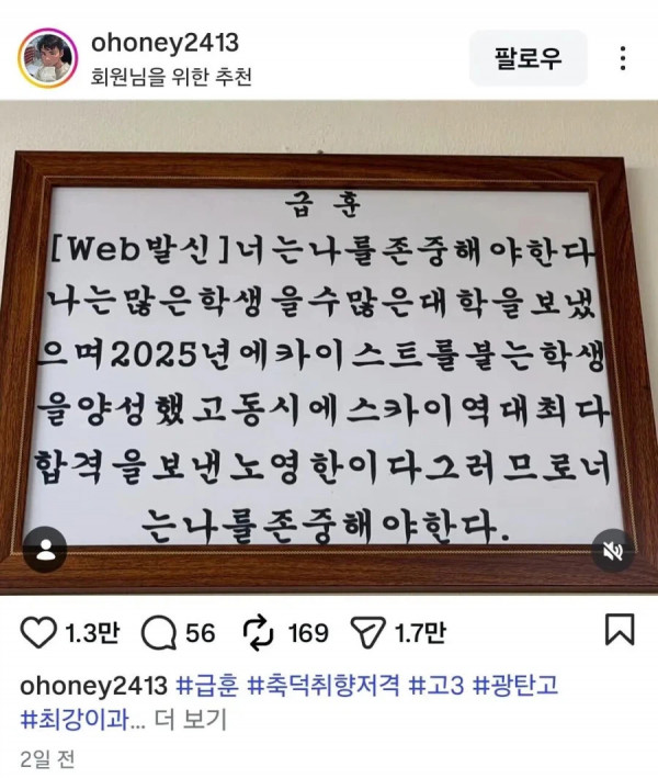 파주 어느 고등학교 선생님의 2026년 급훈.jpg 페이지 정보 작성자 fiveou 댓글 0건 조회 174회 작성일 26-03-14 18:05 목록 답변 글쓰기 본문 (더보기)가 없는게 아쉽 이전글 콜라맛 랭킹 편견 26.03.14 다음글 포코피아 출시 후 스위치2 가격 근황 26.03.14 댓글 0 댓글목록 등록된 댓글이 없습니다.