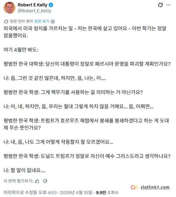 새로운 곤경에 빠진 로버트 켈리씨. 페이지 정보 작성자 fiveou 댓글 0건 조회 186회 작성일 26-04-15 23:20 목록 답변 글쓰기 본문 그 유명한 BBC에서 박근혜 탄핵을 진지하게 인터뷰 하고 있었는데 자녀분들의 두둠칫 기습 난입으로 아내분이 황급하게 수습하는 우당탕 시트콤을 연출하셨던 분입니다. 이전글 많이들 평생동안 모르는 거 26.04.16 다음글 트럼프 "호르무즈 해협 영구적 개방... 26.04.15 댓글 0 댓글목록 등록된 댓글이 없습니다.