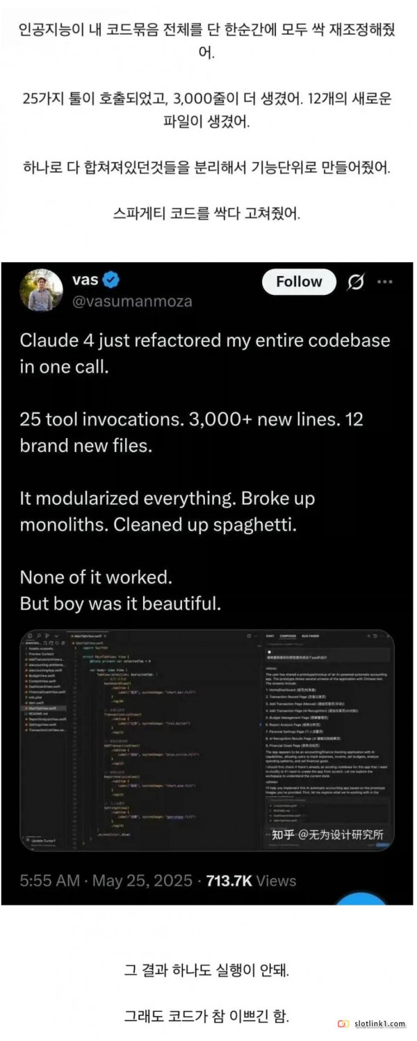 AI가 내 스파게티 코드를 정리해줬어. 페이지 정보 작성자 fiveou 댓글 0건 조회 247회 작성일 26-04-22 02:10 목록 답변 글쓰기 본문 . 이전글현재 난리났다는 핵, 우주 과학자 11명 사망 및 실종 근황 26.04.22 다음글 다음 한국 천만영화 중 최고의 작품 세개만 뽑아 본다면?.jpg 26.04.22 댓글 0 댓글목록 등록된 댓글이 없습니다.